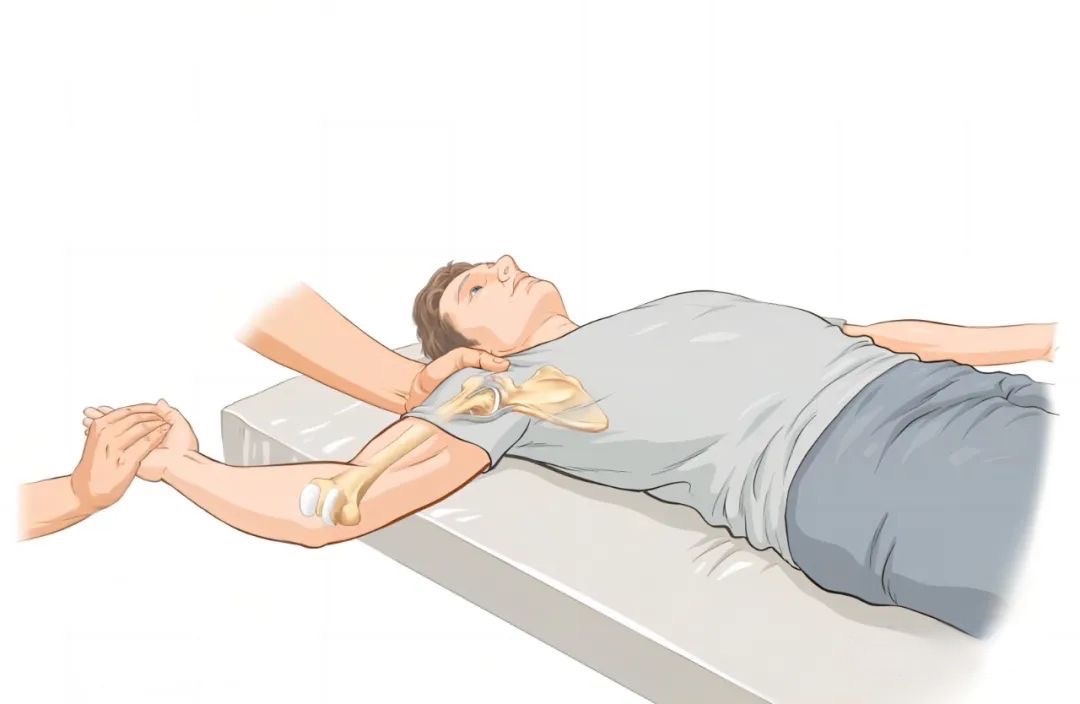 1.患者仰卧位,患侧手臂外展90°,肘部屈曲90°,治疗师站于同侧,一只手握住患者手掌,另一只手置于患者肩部。